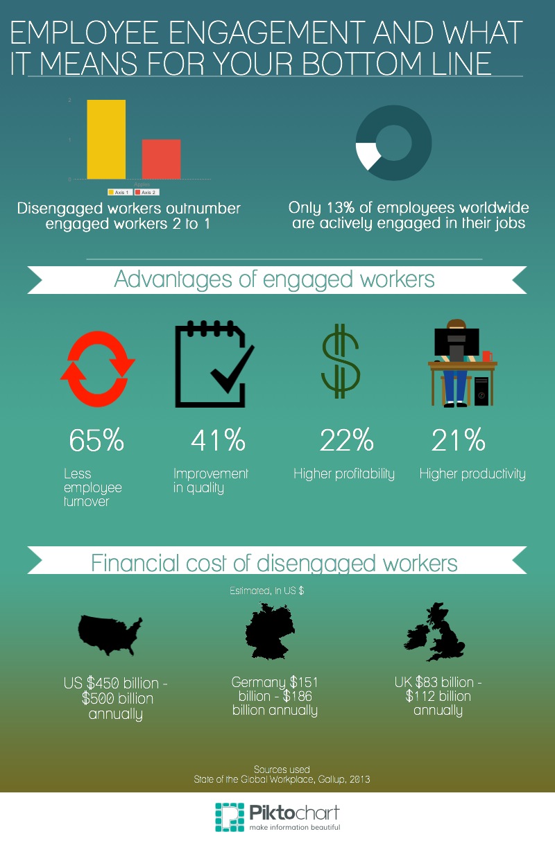 Engagement means that everyone that works for your company cares about the outcome of their work. It means that employees look forward to coming to work and contributing to something worthwhile and larger than themselves. It means they are challenged at work and they view their jobs as more than a pay cheque. They play as a team and value the contributions from other team members.